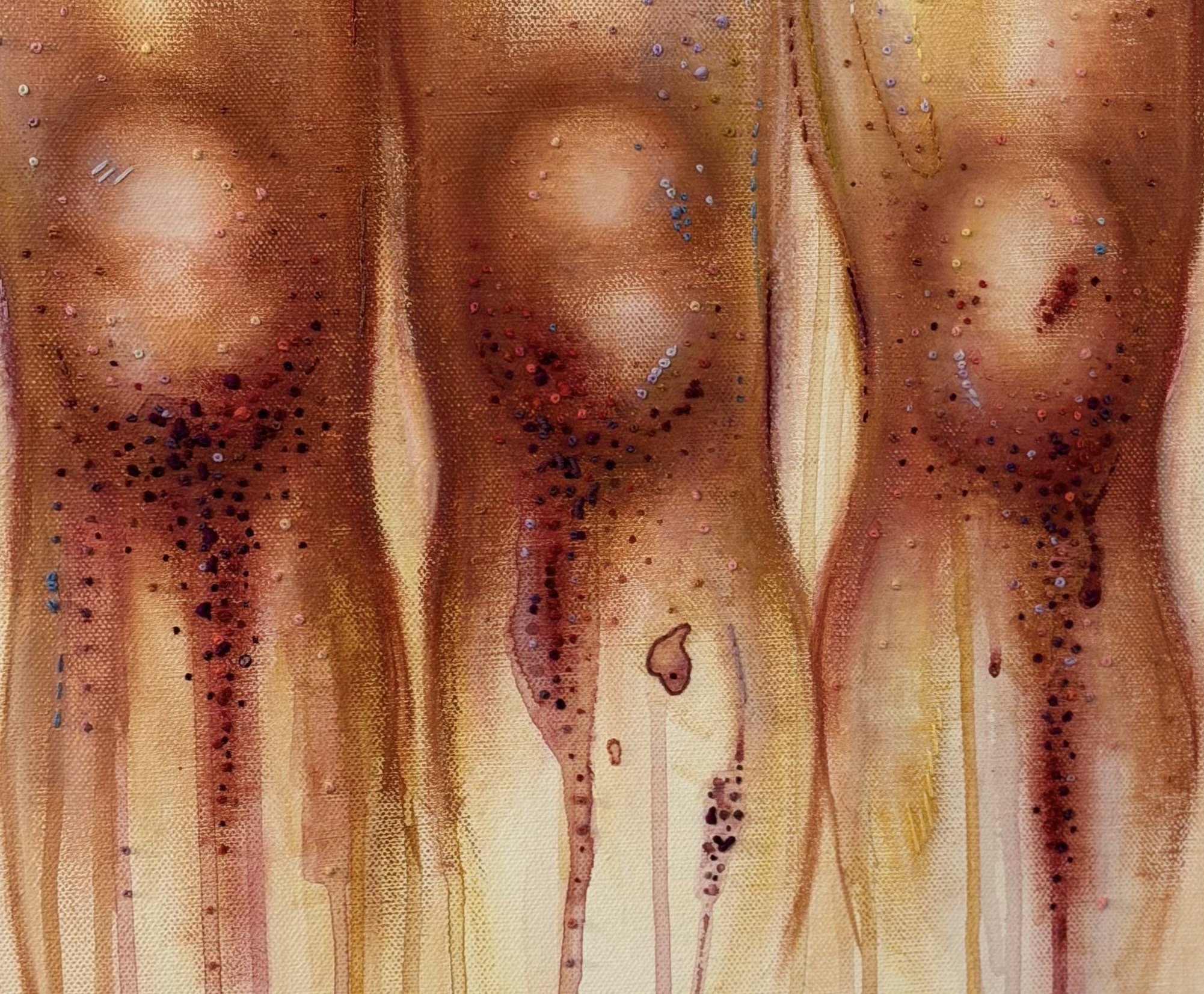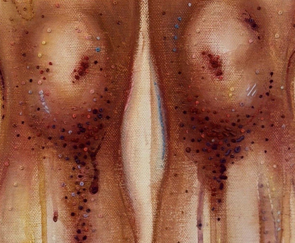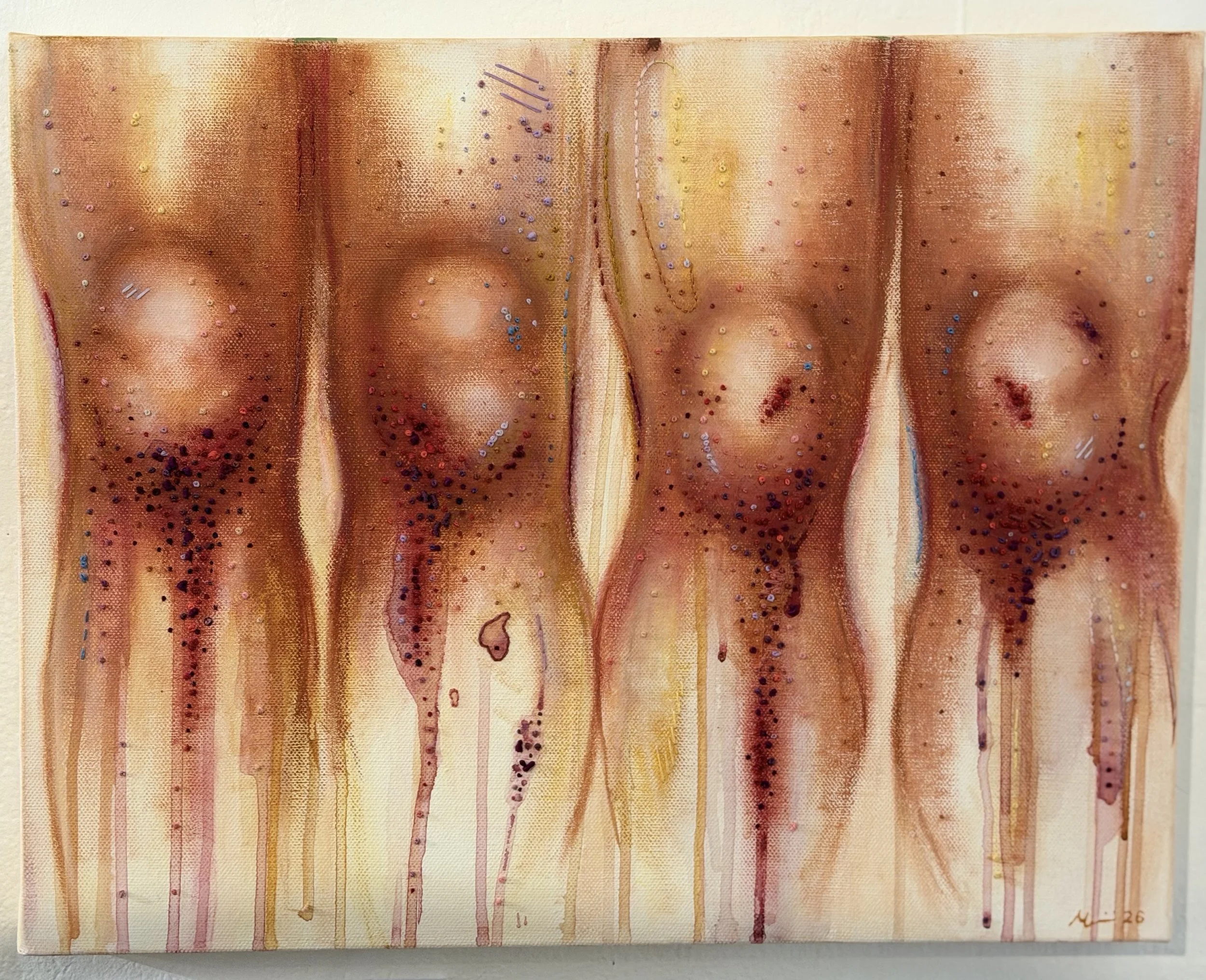 Gouache, Oil Pastel and cotton thread embroidered on Canvas.